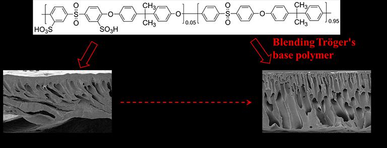 近三年来,​tyc122ccvip膜材料与膜分离研究团队,重点从事基于Tröger's base (TB)类聚合物膜分离技术的研发及其在环境污染治理中的应用。此项成果在前期的探索中,该研究团队发现以磺化聚砜(SPSf)聚合物直接用于制备超滤膜时,膜虽然拥有优异的抗污染性能,但同时由于聚合物链上磺酸基团的存在,使其在相转化成膜制备过程中易被水高度溶胀塑化,导致所制备的超滤膜具有较差的机械强度,不足以支撑膜性能的检测与应用。转换思路,旧物新用,创新利用TB聚合物作为一种功能添加剂,基于TB聚合物自身的弱碱性和自聚微孔性,通过SPSf的磺酸基与TB的叔氨基之间的酸碱相互作用构建一种交联结构,使其在相分离过程中可以促进膜的液-液相分离的固化速率,降低膜断面上皮层的厚度,提高膜表面的孔隙率和孔径,使膜断面拥有更加垂直贯穿的指状孔结构,以此在改善超滤膜机械强度的同时大幅增强超滤膜的渗透通量,达到高速、有效处理水中目标污染物的效果。