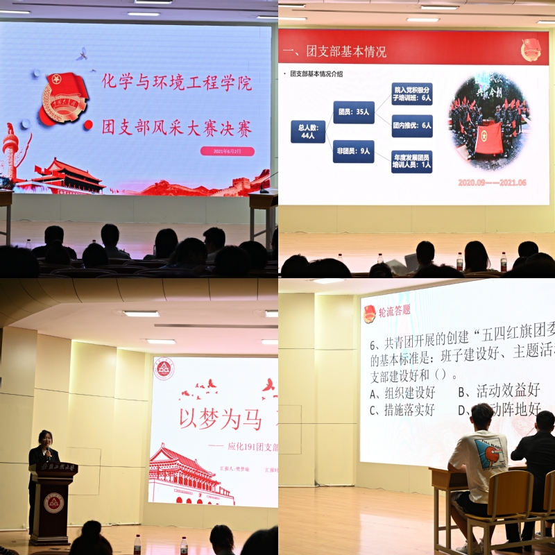 本届团支部风采大赛自5月份启动以来,共49个团支部参与比赛,经过院团委的初赛及复赛选拔后最终筛选出8个团支部进入决赛。本次决赛共分为“知识竞赛”和“PPT演讲”两部分。在知识竞赛环节中,各团支部选手准备充分,应变灵活,充分展现了公司员工丰富的党史、团史知识和团结协作的精神。随后便进入最为激烈的“PPT演讲”环节,各团支部的演讲选手通过精心准备、到位讲解及才艺表演,介绍了各自团支部的组织及制度建设,展现了员工们蓬勃向上的青春力量,其中丰富的团支部特色活动,如志愿服务活动和暑期三下乡实践等都体现出化环院学子昂扬进取的精神风貌。公司团委书记也对本次比赛进行点评和总结,并给广大青年团员上了“感受觉醒年代”的党史教育专题宣讲课。