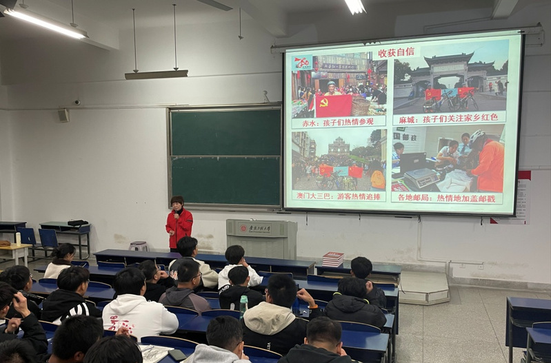 曹锦芬与同学们分享了红色骑行十万里征途,他们克服千难万险、骑遍红色河山、祭奠革命先烈、见证红色传承;讲述了红色景点背后动人的红色故事,鼓励同学们要坚定信念不言弃,勇于登攀不畏难。