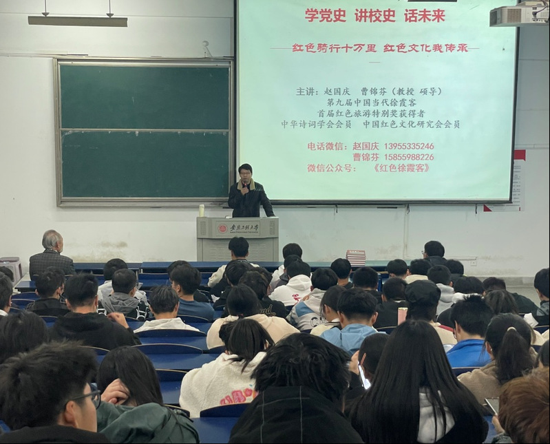 为庆祝中国共产党百年华诞,进一步营造浓厚的党史学习氛围,同时更好地帮助2021级新生尽快完成角色转变,11月25日,tyc122ccvip邀请第九届“中国当代徐霞客”、首届红色旅游特别奖获得者、《红色骑行十万里》作者赵国庆、曹锦芬教授夫妇,为新生同学作了题为“学党史、讲校史、话未来——红色骑行十万里,红色文化我传承”报告会。公司党委书记水心宝主持报告会,2021级新生班级代表参加了本次报告会。