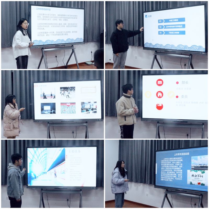 20多名团学组织员工干部依次上台进行述职,述职内容围绕开展政治理论学习、工作成效、纪律作风、服务同学以及存在的问题和改进措施等方面进行,具体汇报了各自的工作职责、工作效果,总结了自己的工作经验,并对未来的工作设想做出安排。