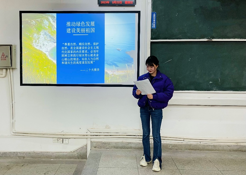 支部成员徐晴枫分享了自己参加的“青年林”志愿活动。照顾一小片绿地,每天去拾起草坪上的垃圾,夏天给干涸的土地浇水,冬天给小树刷上白灰水,通过小树苗一天天的变化,感受到“生态兴则文明兴”。大地给予我们物质的精华,我们也要回馈大地的“青春美貌”。