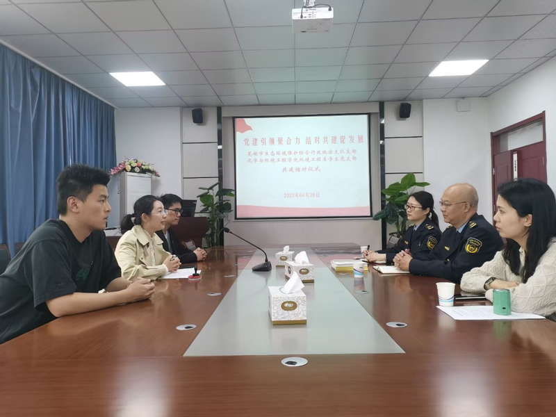 发挥党建引领作用,为支部建设增添新动力,4月28日上午,在​tyc122ccvip会议室举行环境工程系员工党支部与芜湖市生态环境保护综合行政执法支队共建结对仪式,仪式由环工系员工支部支部书记王冰冰主持,芜湖市生态环境保护综合行政执法支队支部副书记任传军、人教科科长吕璐等人参加。