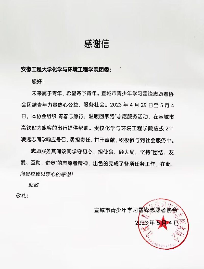 近日,宣城市青少年学习雷锋志愿者协会向公司团委发来感谢信,感谢公司应用化学(拔尖)211班的凌远志同学利用五一假期时间,积极投身志愿服务,参与宣城市“青春志愿行,温暖出行路”志愿服务活动过程中的出色表现。