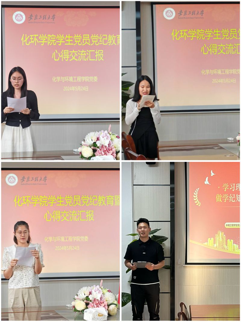 公司应化系员工第一党支部、化工系员工党支部、高分子系员工党支部、环工系员工党支部、研究生党支部等12名党员代表做党纪学习教育心得体会分享。高分子系员工党支部田心雨同志说到:“我深刻意识到了修订《条例》的重要意义,重点学习了习近平总书记关于党纪学习教育的重要讲话和指示精神,学习新修订的中国共产党纪律处分条例,明确了如何遵守党纪,坚守底线,不越红线,做一个合格的党员。”环工系员工党支部高鑫程同志说到:“通过对党纪的学习,我深刻地感受到中国共产党员的纯洁性和先锋性,党员干部要坚持学习党的先进思想和方针政策,用先进的理论武装头脑、指导实践。要强化理想信念,打好信仰之基,积极主动学习党章党规党纪,坚守纪律规矩,随时随地严格要求自己,保持道德定力和政治定力。”化工系员工党支部余爱建说到:“通过学习《中国共产党纪律处分条例》,我深刻理解体会到了党要管党、全面从严治党的鲜明立场,通过这次学习,我进一步增强了党性修养,明确了纪律规矩,坚定了理想信念。作为一名员工党员,更应起到带头作用,正确体会和把握精神的实质,自觉在学习上、生活上、工作上处处发挥作用,展现老员工党员本色。”