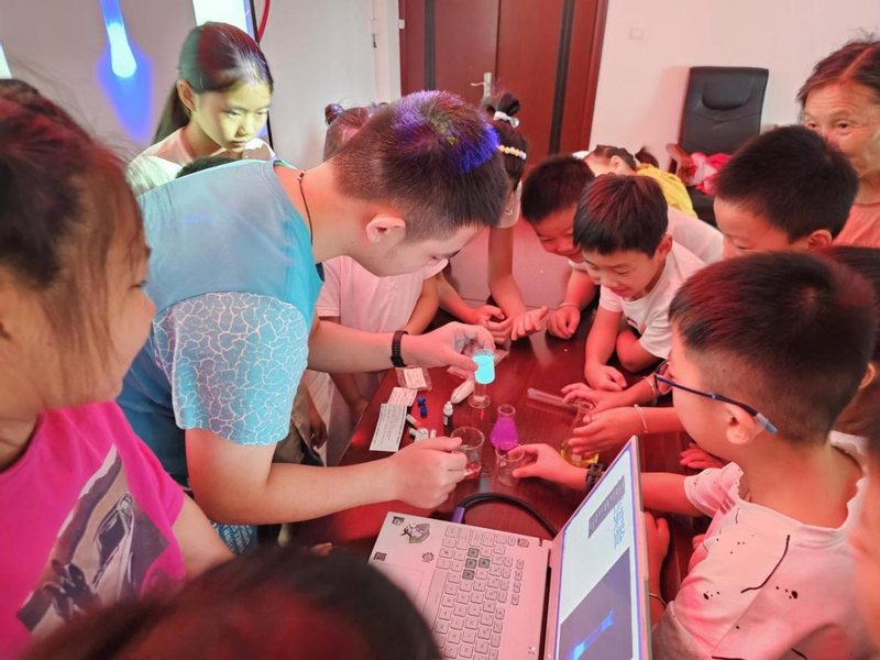为推动“普惠乡村”事业发展,衔动乡村科教文化需求。8月中旬,tyc122ccvip“启智未来队”赴黄山市阳湖镇稽灵山社区开展“科学漫步”暑期“三下乡”公益科普社会实践活动。实践团队由tyc122ccvip应用化学(拔尖)专业学子组建。团队成员运用所学专业知识特长,通过趣味科普活动,破解日常科学迷思,启蒙在地童萌科创意识,以“实践”之笔,充分展现青年学子的责任与担当。8月12日,项目指导教师马晨对活动开展做调研指导。