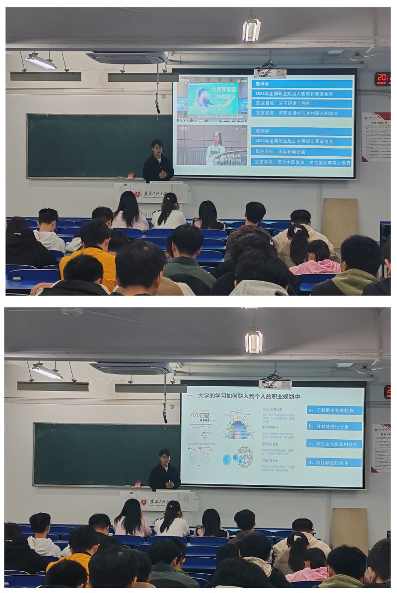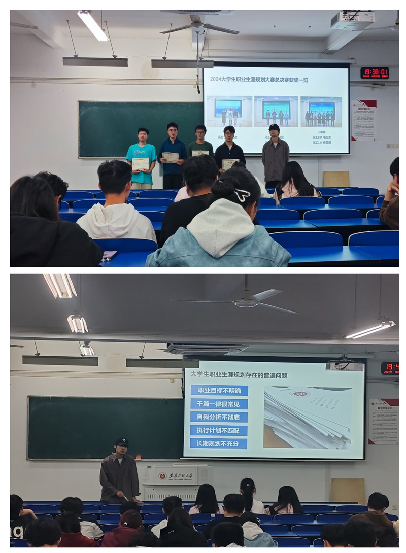 活动第三环节由公司2024年度职业生涯规划总决赛一等奖获得者高分子231吴徐同学发表赛后感悟。吴徐同学回顾了备赛过程,并对辅导员马晨老师、专业导师在备赛中给出的指导建议表达了感谢,并在第一时间对赛后收获与同学们进行了分享。在提及备赛时观察不同角度所带来的启发时,吴徐同学表示拓宽视野、学习国赛成功案例可提升备赛效率。他呼吁在座同学将个人职业规划融入大学日常生活中,要为未来的老员工活制定明确的执行计划。此外,吴徐同学也分享了保持良好心态的重要性,以及如何培养持续学习与适应变化的能力。