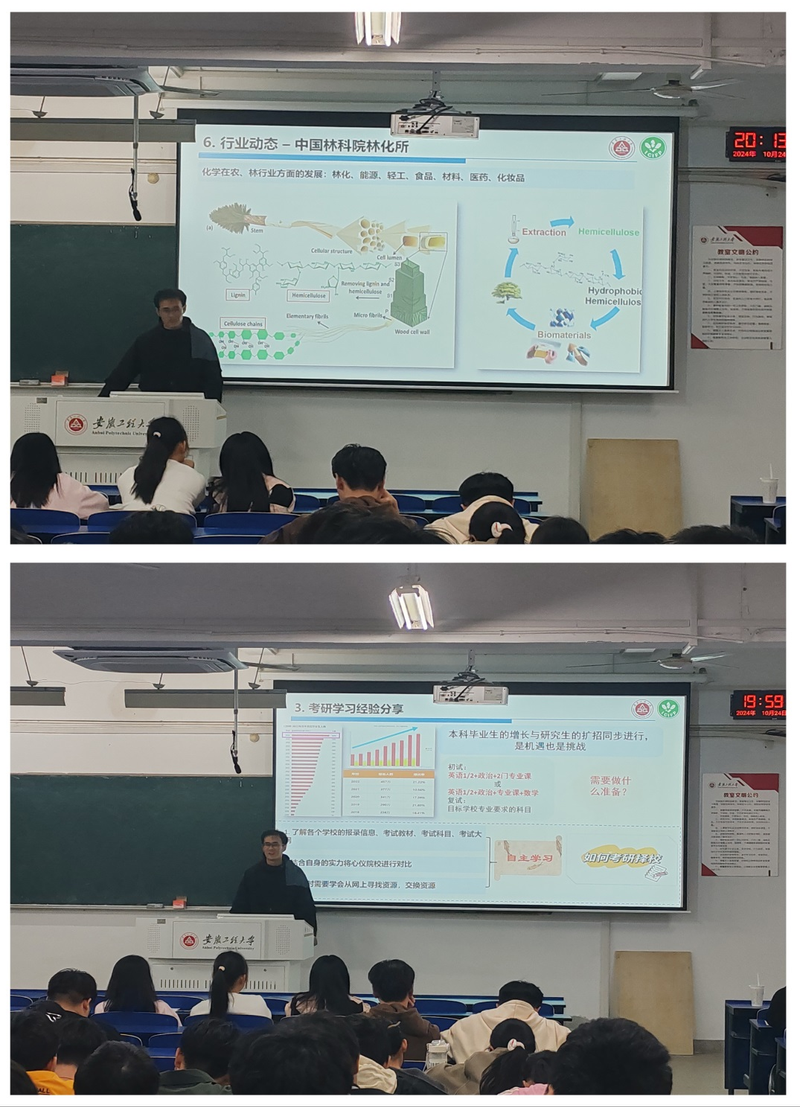 活动第二环节由公司2016级应用化学专业员工、中国林业科学研究院林产化学工业研究所在读博士研究生刘勇展开分享交流。他从个人经历出发,与同学们分享了在专业学习、考研、员工干部工作等不同层面的扎实经验,并着眼未来,分析了行业动态、就业形势及研究生生活体验。他呼吁同学们珍惜时间,爱惜身体,自主学习,终身学习。