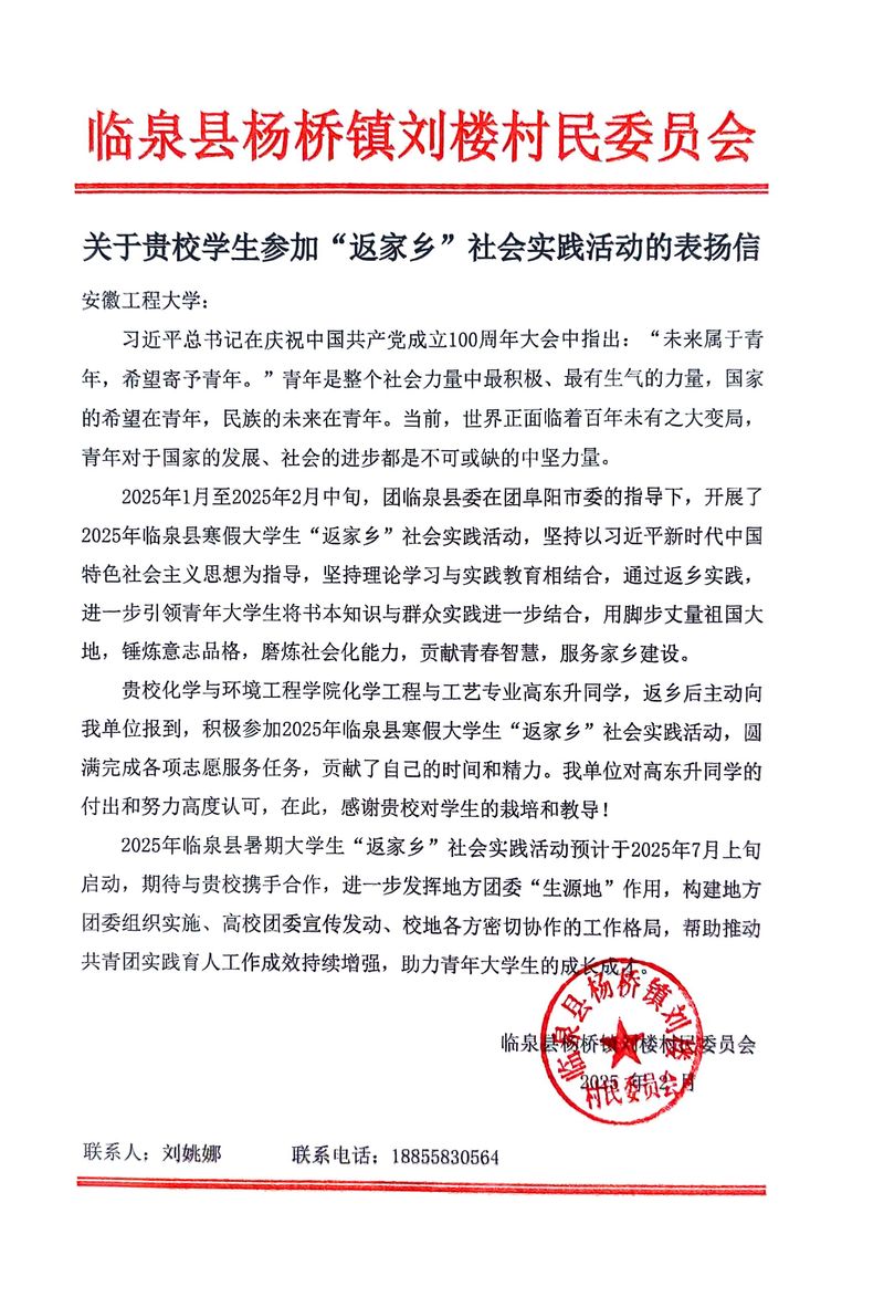 2月17日,公司tyc122ccvip化工242班学子高东升在寒假期间积极参与“返家乡”社会实践活动,凭借出色的表现和无私奉献的精神,获得了当地相关单位的高度认可,并收到了表扬信。