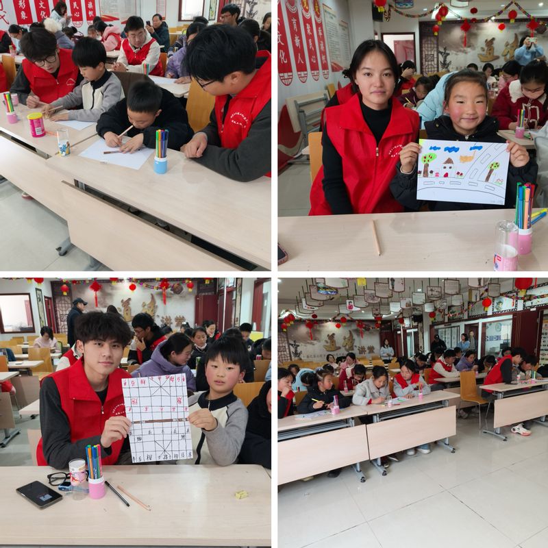 创作过程中,志愿者们化身“创意导师”,俯身轻声指导孩子们配色技巧、构图方法,耐心解答“怎么画火箭的火焰”“未来的房子要加什么细节”等问题。遇到思路卡壳的小朋友,志愿者会用趣味提问引导他们打开脑洞,让想象的火花持续迸发。当一幅幅充满童趣的作品逐渐成型,孩子们的脸上满是成就感,纷纷举着画作和志愿者合影留念。